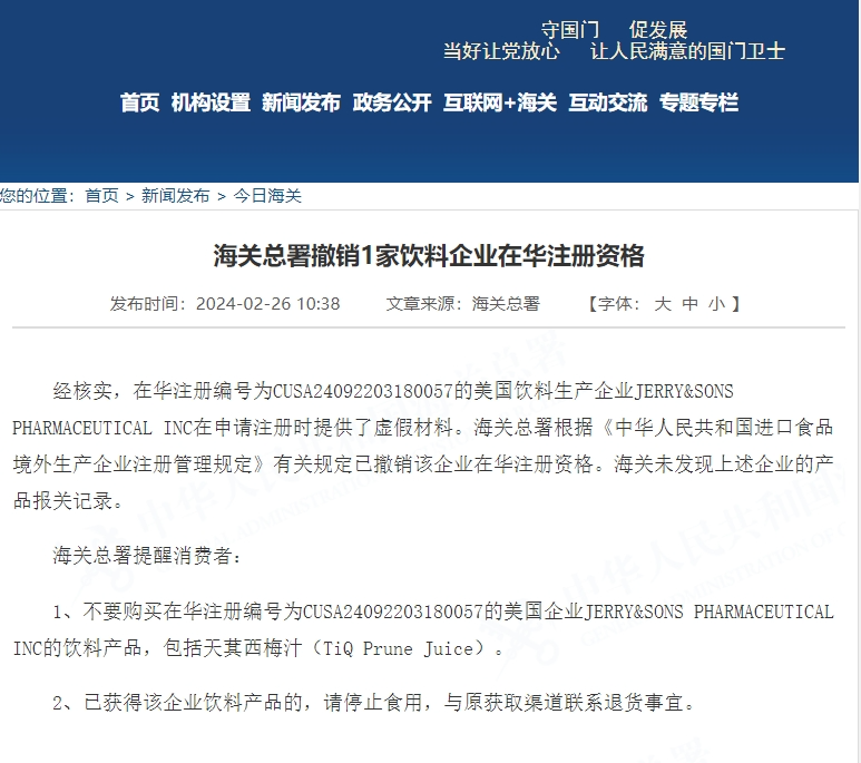 海关总署官网26日发布消息:在华注册编号为CUSA24092203180057的美国饮料生产企业JERRY&SONS PHARMACEUTICAL INC在申请注册时提供了虚假材料。海关总署根据《中华人民共和国进口食品境外生产企业注册管理规定》有关规定已撤销该企业在华注册资格。