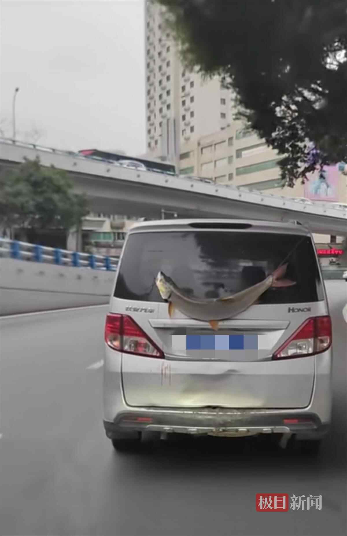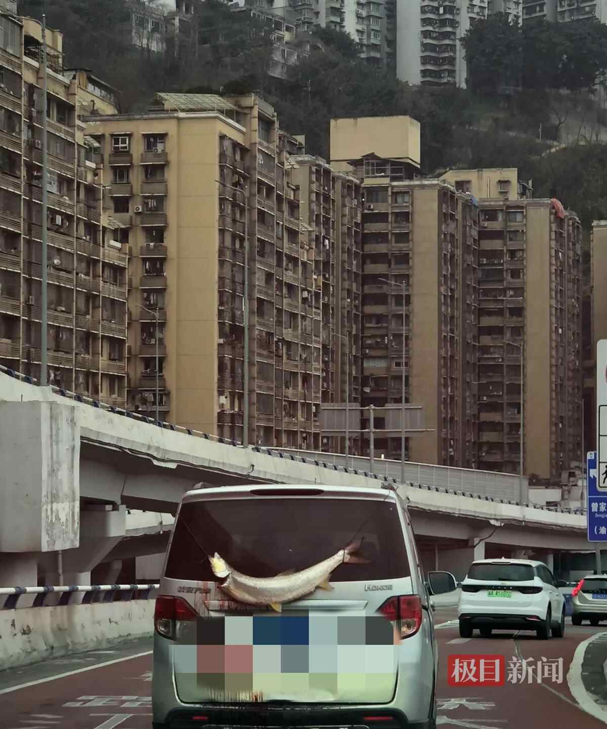 记者在杨先生拍摄的视频中看到,大鳡鱼头尾被绳子拴着挂在面包车的尾门上,面包车在路上穿行。在评论区,见过这辆车的其他网友也发出了视频。一位网友发出图片称,27日上午他驾车从菜园坝往曾家岩方向经过,也看到这辆挂着鱼的面包车。