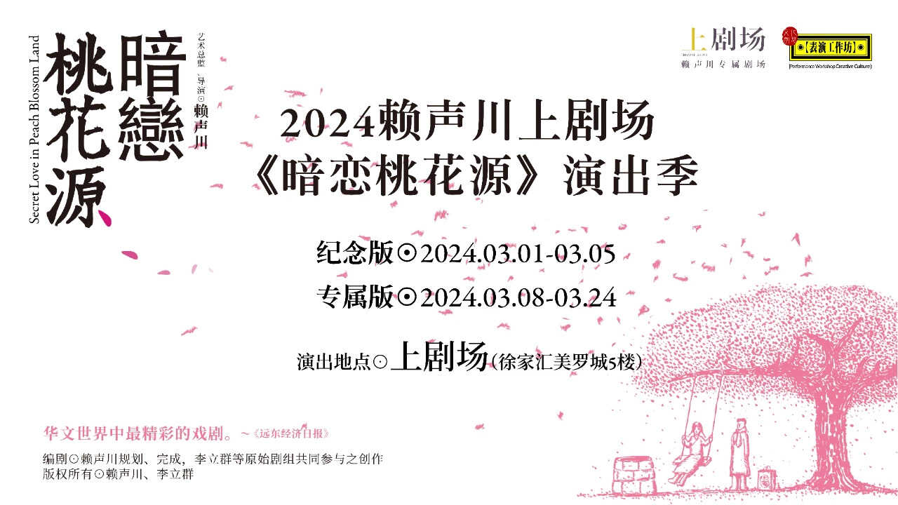 专属版《暗恋桃花源》由赖声川亲自培养的上剧团阵容出演,2017 年在上剧场诞生,自 2023 年起开启上剧场驻场模式。赖声川说,希望能让更多观众随时在繁华的市中心觅得一隅“戏剧桃花源”。