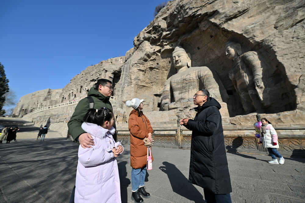 杭侃(右)在给游客讲解云冈石窟的历史知识(2月25日摄)。