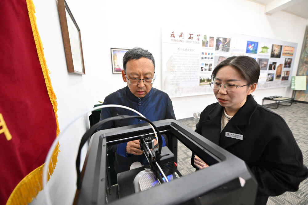 在云冈研究院数字化保护中心,杭侃(左)和同事交流文创产品设计方案(2月25日摄)。