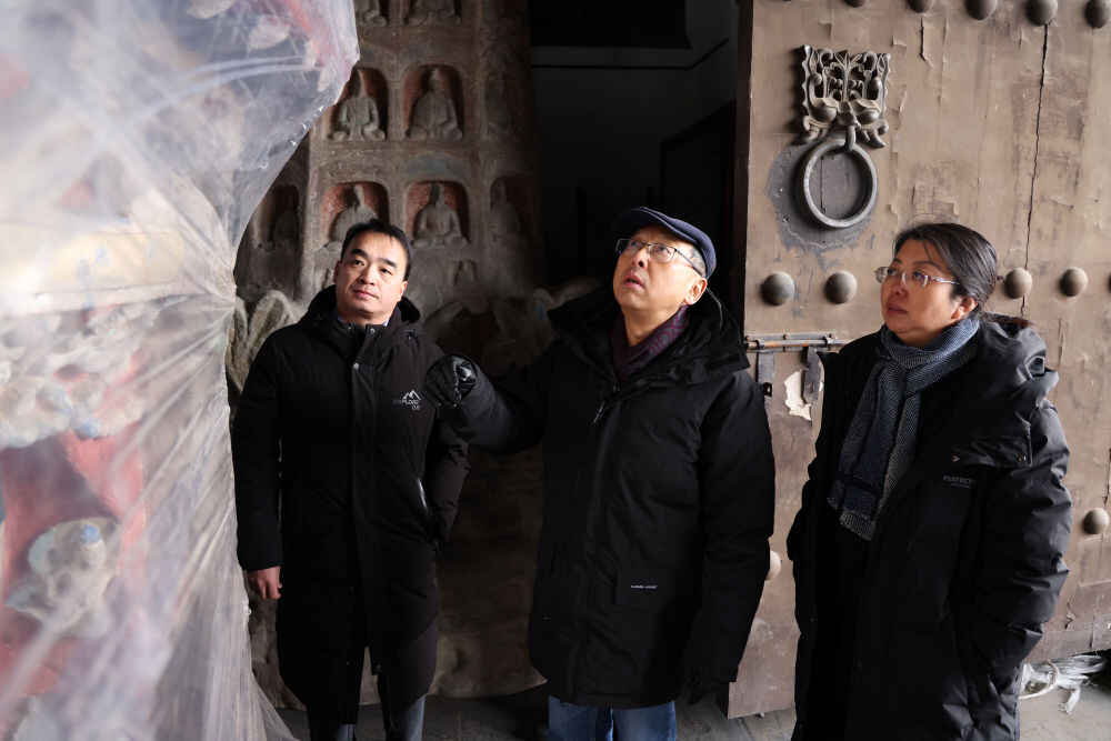 杭侃(右二)在云冈石窟调研走访,了解游客的需求(2月25日摄)。