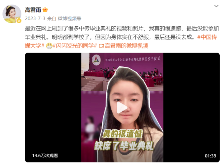 7月,她也发视频称因身体原因错过了中传的毕业典礼,还透露自己的身体已经虚弱到也许不能支撑拍摄视频了……