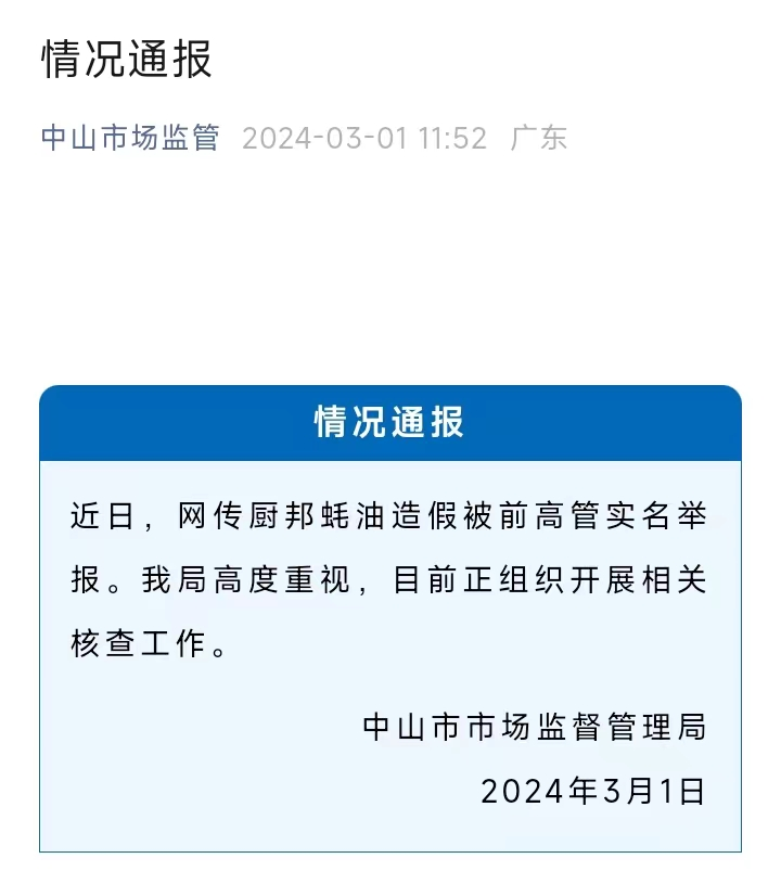 3月1日,中山市市场监督管理局就近日“网传厨邦蚝油造假被前高管实名举报”一事发布情况通报。通报称高度重视此事,目前正组织开展相关核查工作。