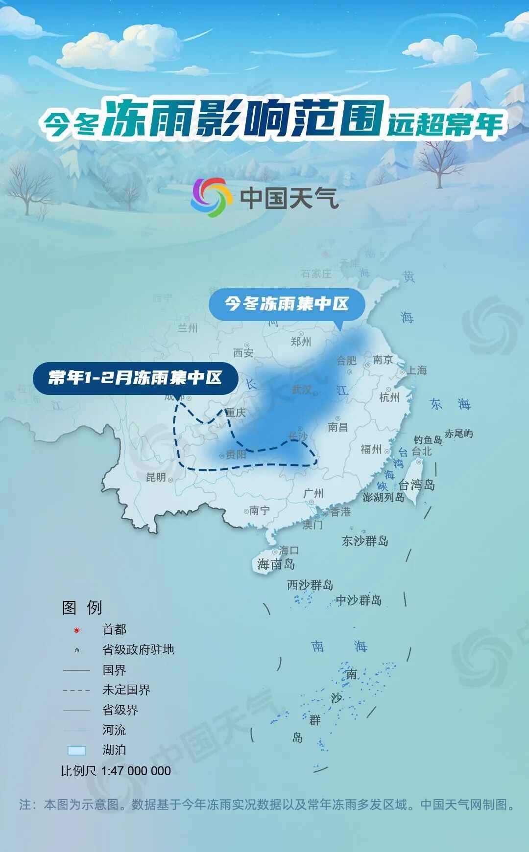 除此之外,在今冬出现的雨雪冰冻天气中,冻雨相比常年也十分突出,不仅影响范围更广,而且冻雨集中区位置更偏北、偏东。