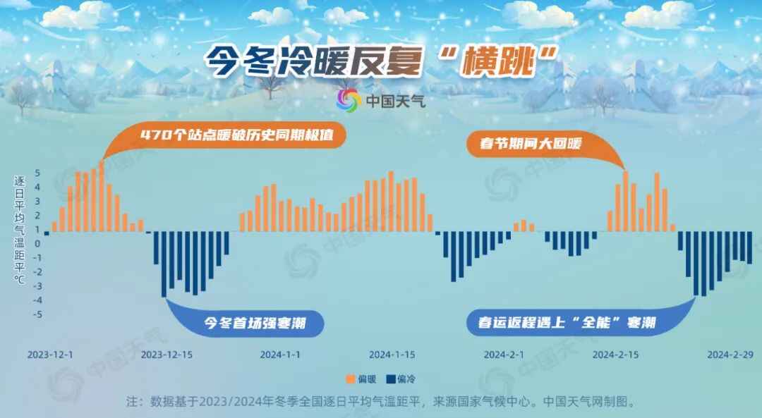 “冷暖交替出现、起伏大,空间分布差异大是今冬气温的显著特点。”中国天气网气象分析师张娟表示,今年冬季我国总共遭遇了三次寒潮过程,其中两次为强寒潮,过程降温显著,而每次寒潮结束后,又会经历气温的明显回升,因此给人一种冷暖反复“横跳”的感觉。通常在厄尔尼诺年的冬季,都会有阶段性冷空气偏强的情况出现。同时,由于今冬副热带高压也偏强,南支槽活跃,造成暖湿气流非常强盛,从而导致冷暖起伏较大。