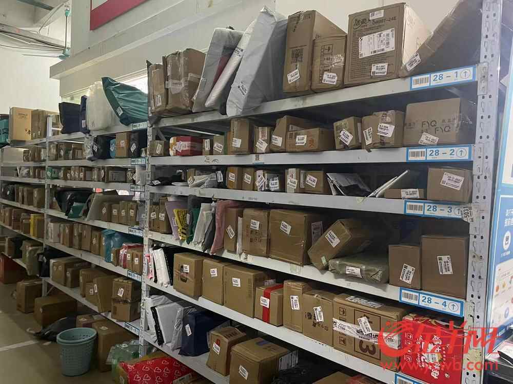 天河区某菜鸟驿站内的快递直堆积到小区廊道