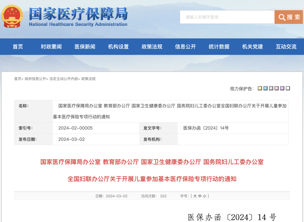 国家医保局、教育部、国家卫生健康委等部门3月2日发布《关于开展儿童参加基本医疗保险专项行动的通知》,明确提出要切实提高儿童参保率,力争到2024年底,80%以上新生儿在出生当年参保。