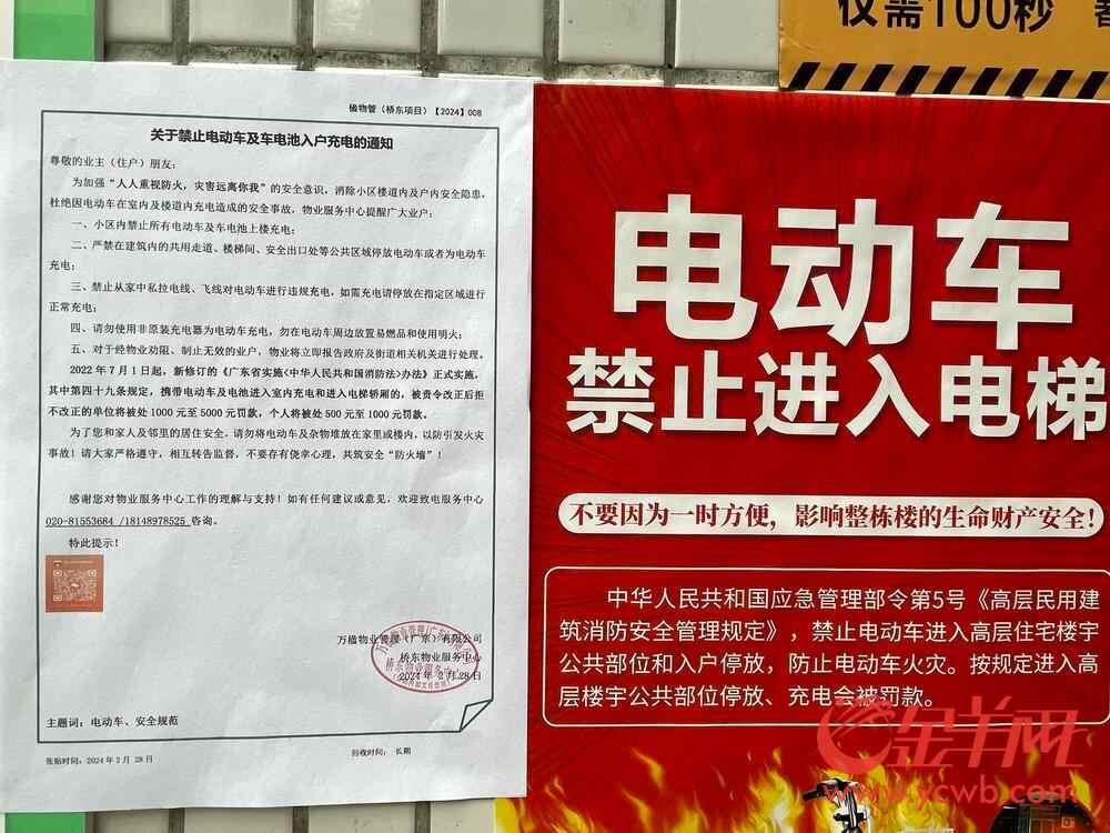 记者2日在黄埔区万科中心看到,不少电动自行车整齐停放在黄色标识区域内,带有遮阳雨棚的停车位设置有20个充电接口,小区楼栋入口两侧虽有车辆停放,但均设置有可移动围栏以保障主干道畅通。该小区物业公司客服代表说:“由于小区是开放式的,来往入内的车辆较多。接到相关通知后,我们通过划分停放区域、加强巡查引导,在各楼宇也张贴了告示,禁止车辆入内上楼,保障业主安全。”