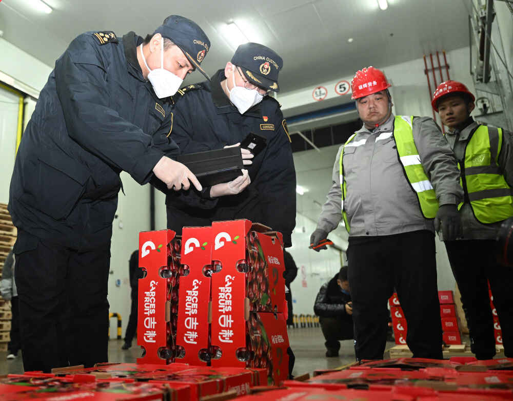 2024年1月17日,在天津东疆保税港区,东疆海关工作人员在查验进口车厘子。新华社记者 赵子硕 摄