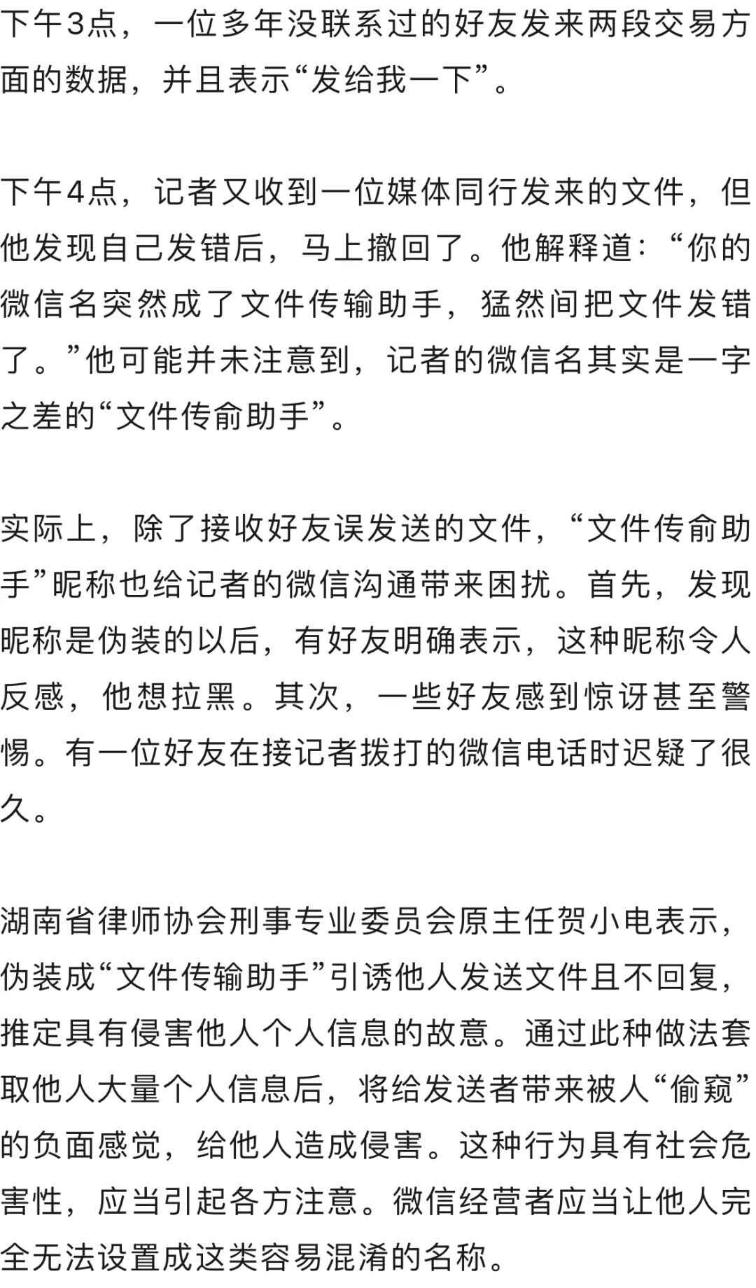 近日,安徽一女子发文称,她微信好友中有人伪装成“文件传输助手”,导致她发送了大量私人信息,时间长达9年。