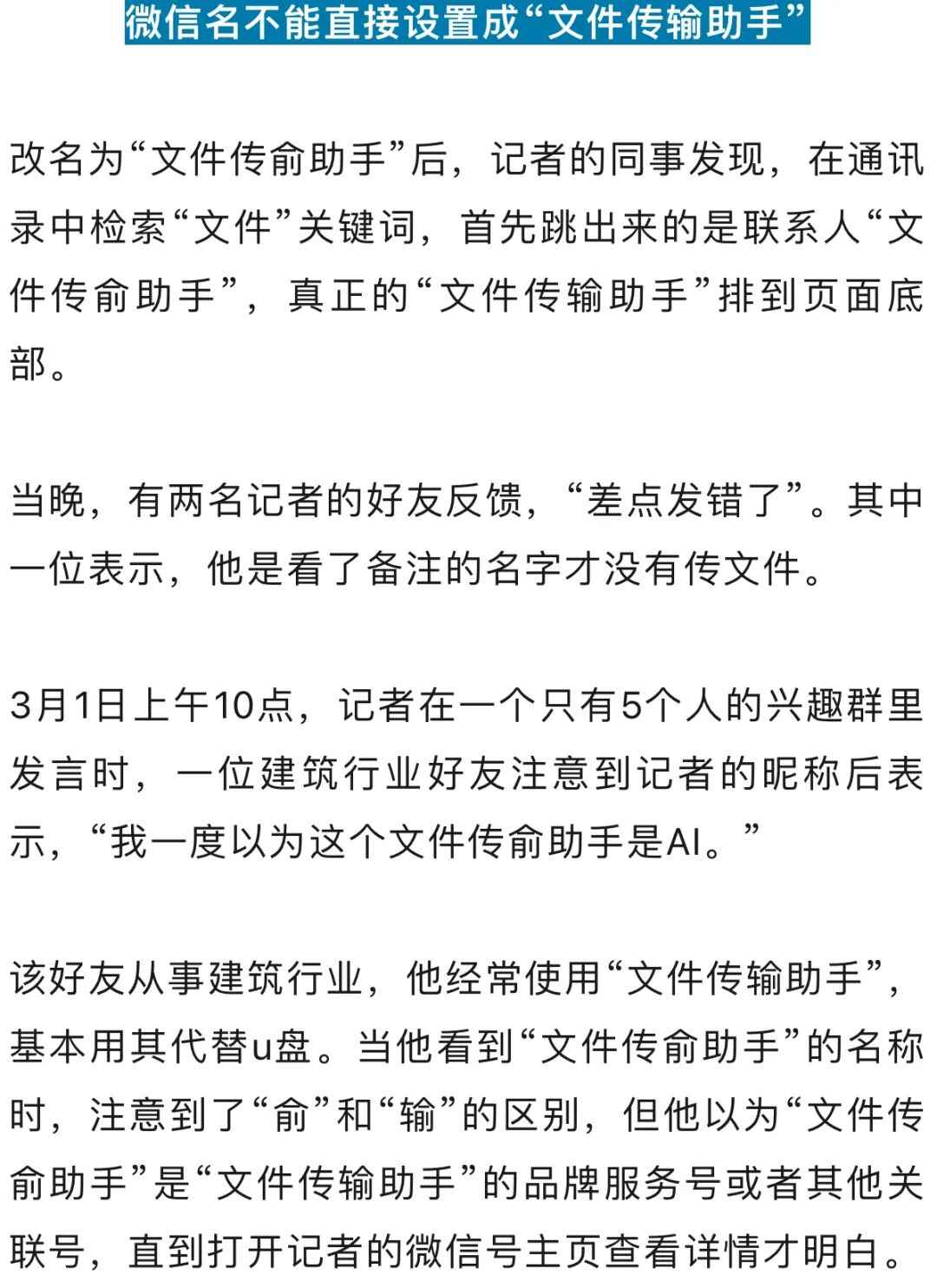 微信可以将昵称改成“文件传输助手”或与其相似的名称吗?这样改名是否会导致用户误认?从2月29日下午开始,记者进行了24小时的测试。