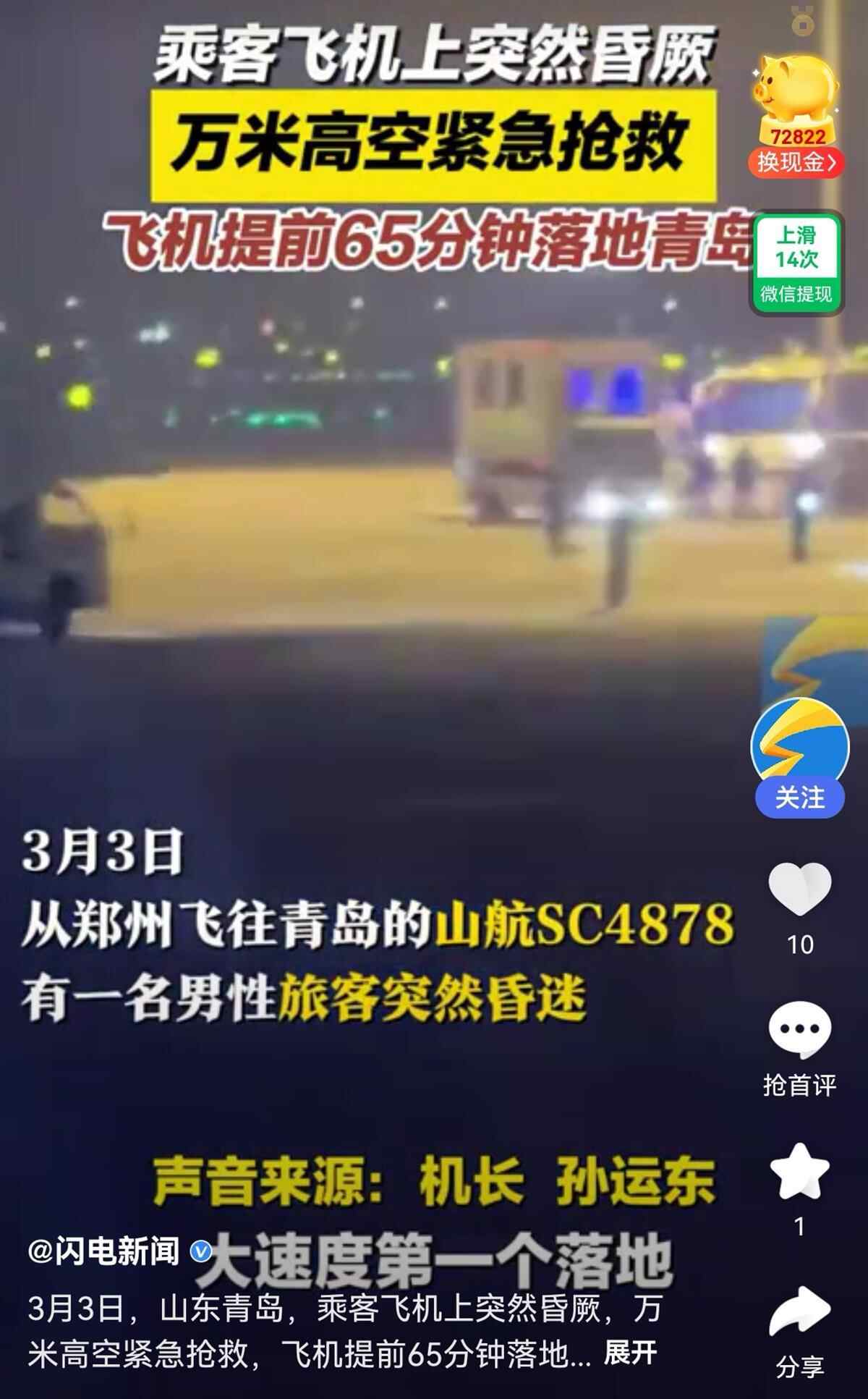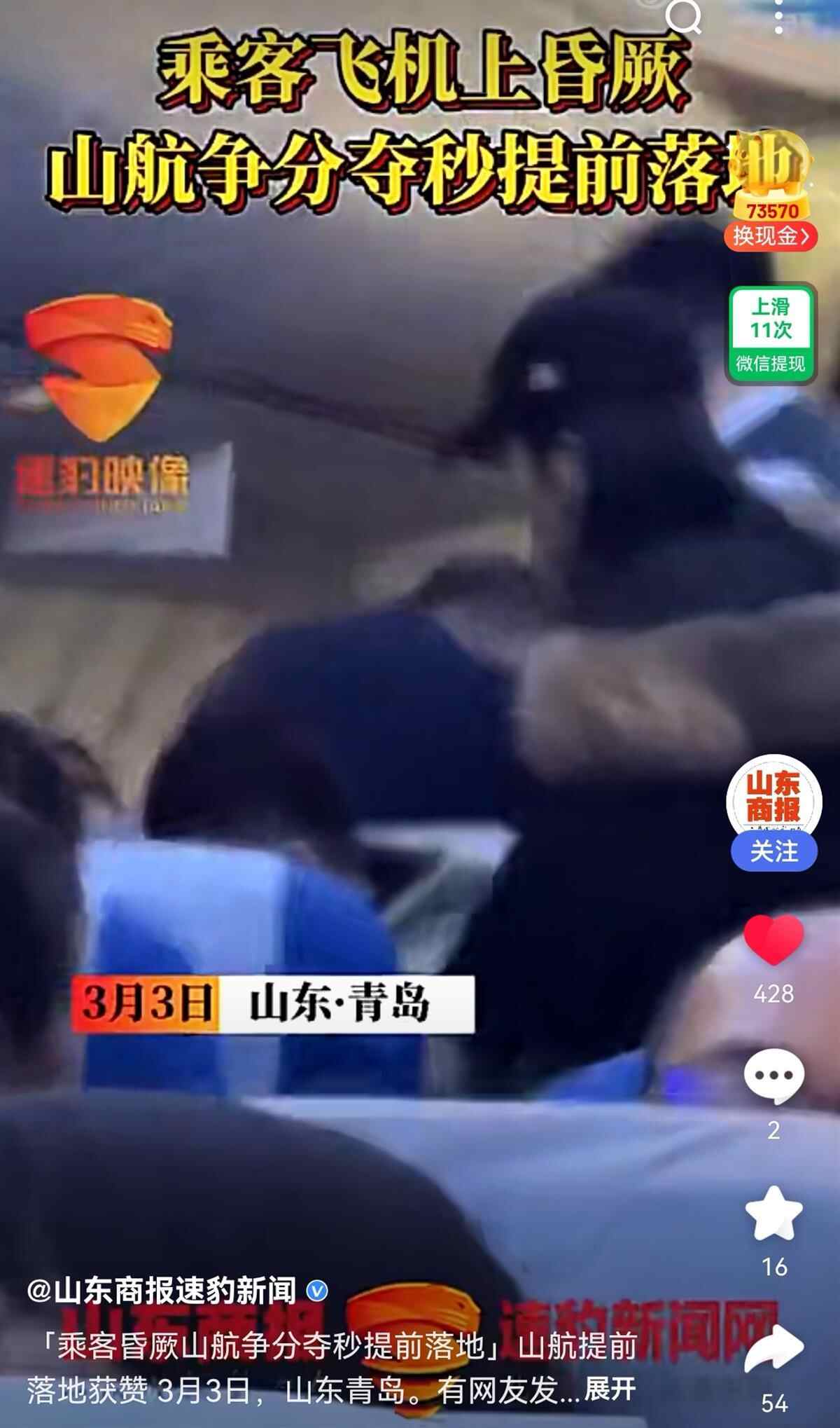 据澎湃新闻3月4日报道:3日,网友发视频点赞山东航空,航班上有乘客晕厥,客舱乘务员及时抢救,飞机提前一小时抵达目的地。机长事后现身评论区:“确切的说是提前65分钟”,并晒出当天朋友圈截图说“为你保驾护航职责所在,祝一切安好!”