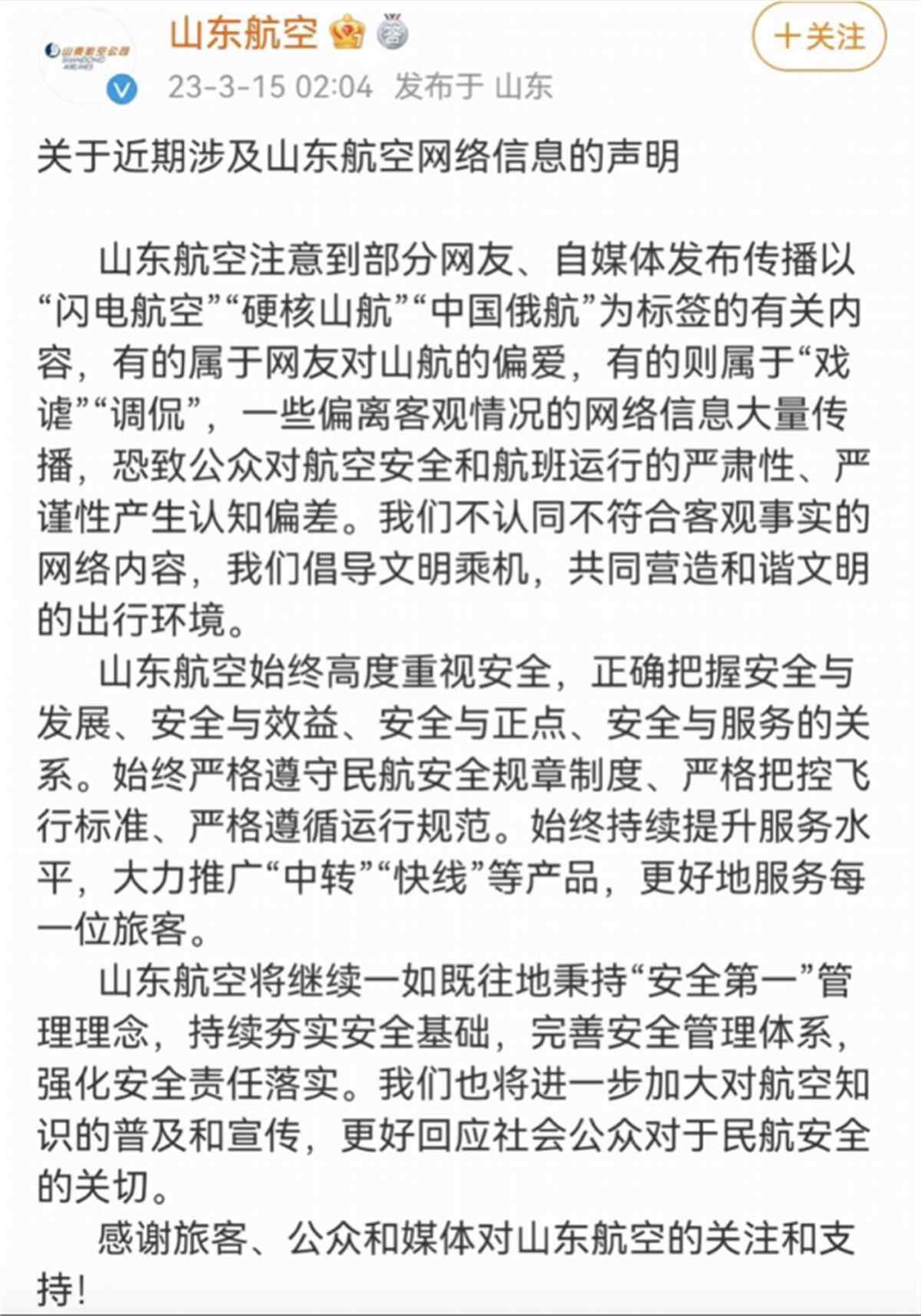 当时山东航空发布声明称,山东航空始终高度重视安全,正确把握安全与发展、安全与效益、安全与正点、安全与服务的关系。