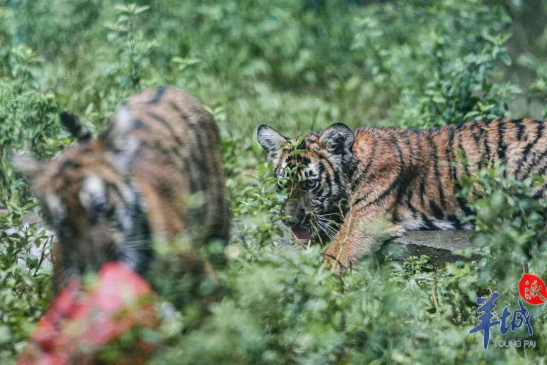 华南虎双胞胎“芙蓉”和“莲花”在玩耍。羊城晚报记者 周巍 摄