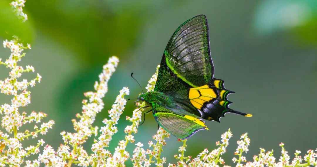 “蝶中皇后”金斑喙凤蝶在花间飞舞。韶关市政府新闻办供图