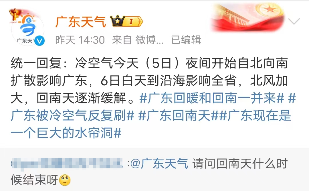 不过,比起回暖的快乐,还是有网友直接在线@广东天气 ,询问“阿南”什么时候才能离开。