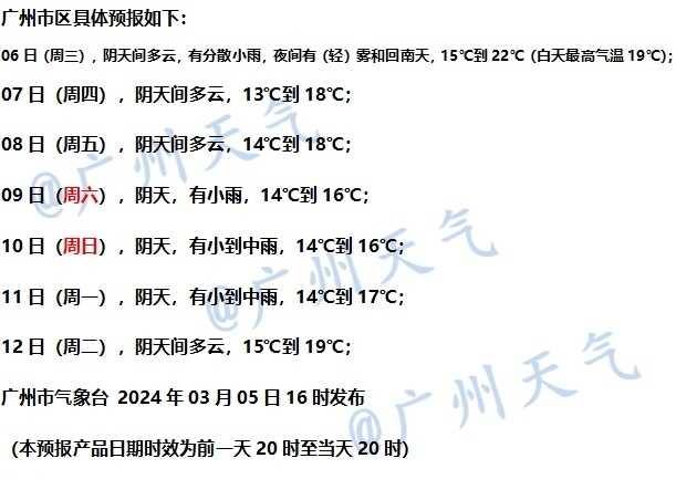 6日(周三),阴天间多云,有分散小雨,夜间有(轻)雾和回南天,15°C到22℃(白天最高气温 19℃);