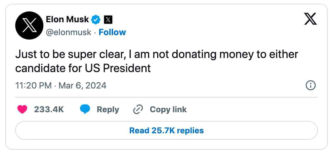 据路透社报道,马斯克6日在社交平台X上发文称,“特别明确一下,我不会向任何一位美国总统候选人捐款。”