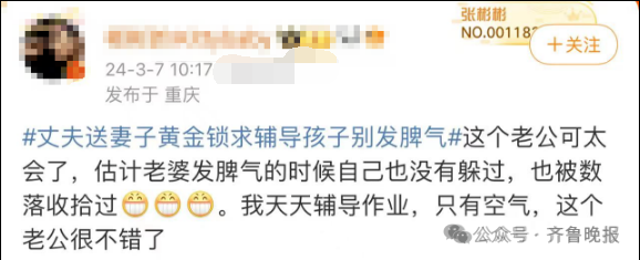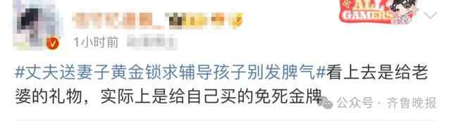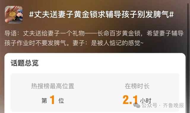 3月4日,山东烟台一位爸爸为了安抚妻子,想出了一个“妙招”,送给妻子一个礼物——长命百岁黄金锁,希望妻子辅导孩子作业时不要发脾气。