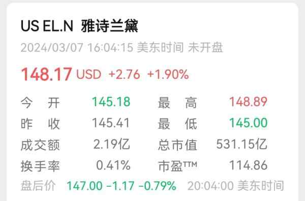 截至美东时间3月7日收盘,雅诗兰黛报148.17美元/股,涨1.90%,总市值531.15亿美元。