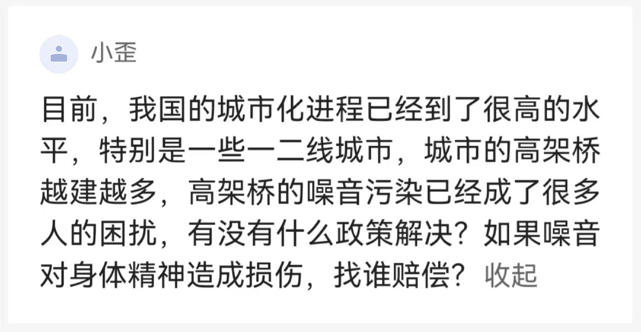 针对这个问题,全国人大代表、上海交通大学特聘教授黄勇平给出了相关建议,关于高架桥噪声污染防治管理方法,实际上国家对这方面非常重视,比如说2022 年国家出台了《环境噪声防治法》, 2023 年还出台了《环境噪声行动方案》,里边都提到了各方面怎样很好地来解决噪声问题。