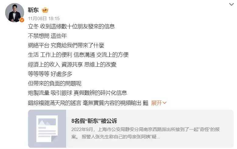 2023年11月,靳东转发相关案件进展时再次发声:这些年网络平台给人们带来了诸多好处,但也产生了炮制流量、吸引眼球、碎片化信息、谣言、艳俗内容等种种问题。