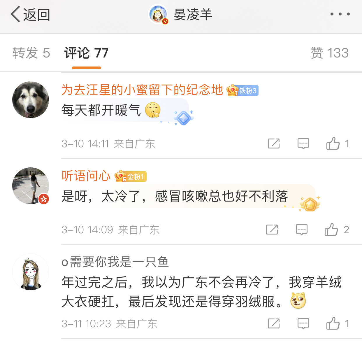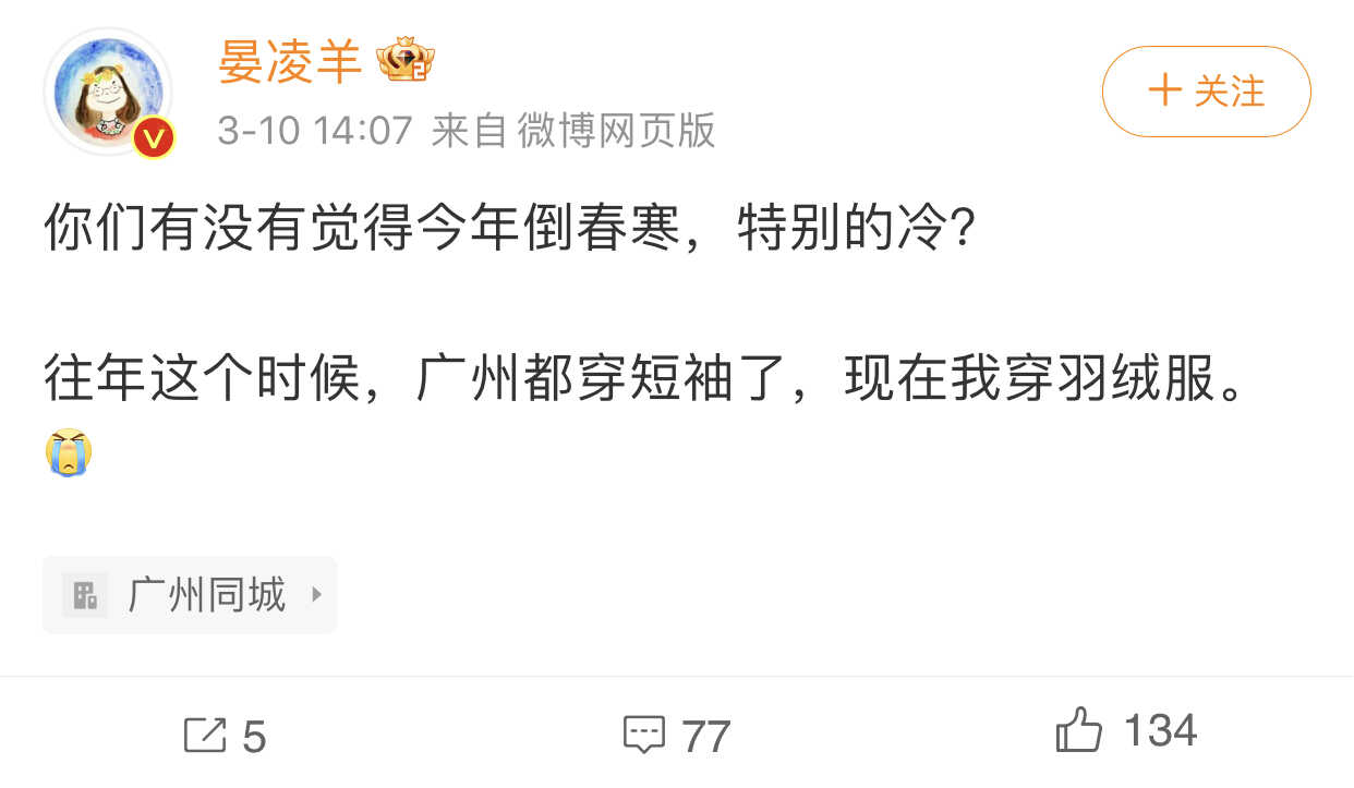 “你们有没有觉得今年倒春寒,特别的冷?往年这个时候,广州都穿短袖了,现在我穿羽绒服。”3月10日,有超过60万粉丝的新浪微博博主“@晏凌羊”发帖吐槽广州近期的天气。根据“@晏凌羊”发言,往年此时广州的天气已可以穿短袖,但2024年同期广州的天气仍需要“穿羽绒服”。
