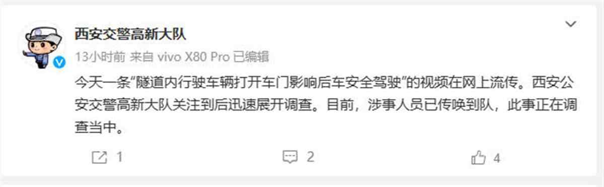 近日,陕西西安,一段“隧道内行驶车辆打开车门被指恶意别车”的视频在网上流传,引发关注。视频中一辆黑色汽车在陕西西安科技八路隧道中行驶时,加速追上前方白车,在并线过程中,副驾驶打开车门,疑致使车门与白车发生碰撞,之后驾车加速驶去,不少网友看完视频直接在评论区喊话西安交警“请处理”。