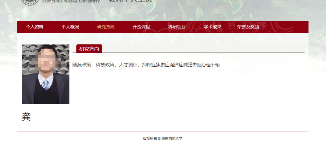 据华东师范大学官网披露,2023年9月,华东师范大学整合学校优势力量,合并原城市与区域科学学院、原地理科学学院,组建新的地理科学学院。3月13日,记者检索华东师范大学官网,检索到龚某的照片,部门为地理科学学院,研究方向为能源政策、科技政策、人才测评、抑郁症焦虑症强迫症减肥失眠心理干预。