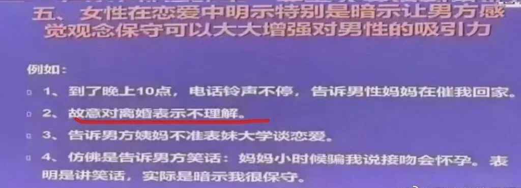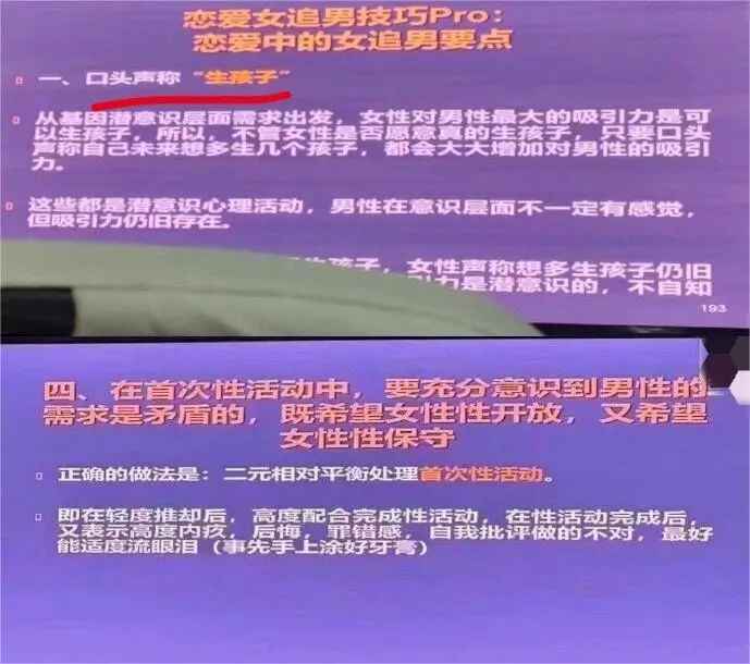 根据网友发文爆料的《爱情心理学》课件图片显示,内容有“女性在恋爱中明示特别是暗示让男方感觉观念保守可以大大增强对男性的吸引力”、“口头声称女性对男性最大的吸引力是可以生孩子,只要口头声称自己未来想多生几个孩子,都会大大增加对男性的吸引力”、“在首次性活动中,要充分意识到男性的需求矛盾,既希望女性开放,又希望女性保守”等表述。