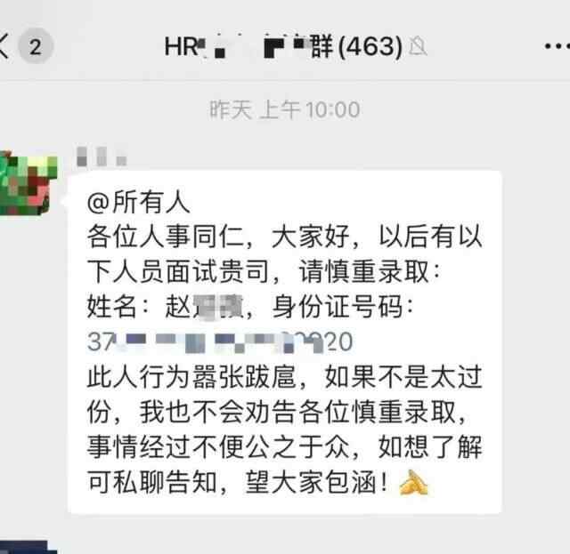 “我更难接受的是,有人截图告诉我,负责人事的张经理居然未经我同意,把我的姓名、身份证号在一个‘HR’群公开发布,严重侵犯了我的隐私权和名誉权。”根据赵女士提供的截图,张经理将其隐私信息发布,并发布文案说“此人行为嚣张跋扈,如果不是太过分,我也不会劝告各位谨慎录取。事情经过不便公之于众,如想了解可私聊告知”。