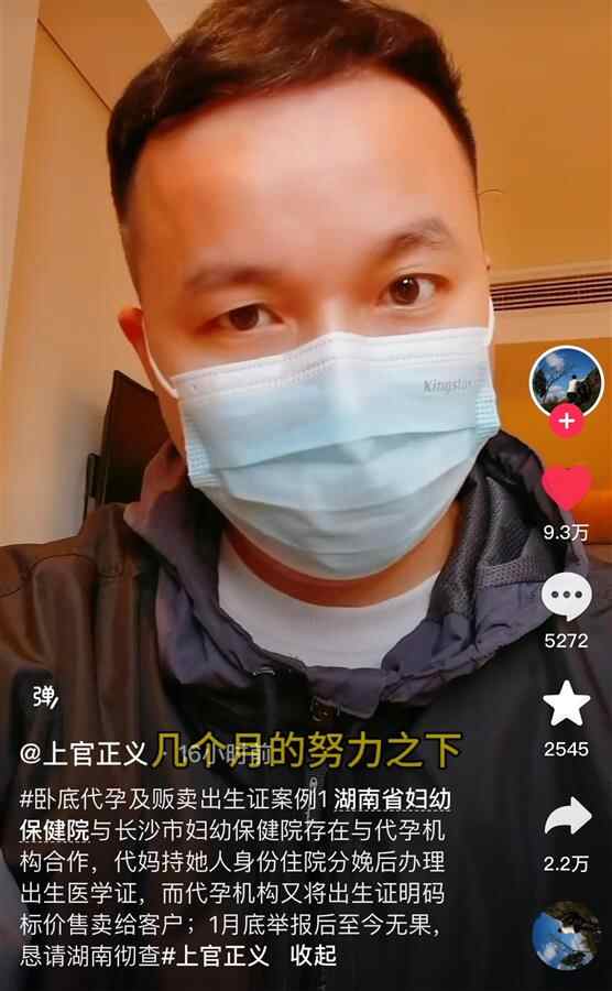 上官正义在视频中说,2024年1月,经过长达一个月的努力,他发现湖南省妇幼保健院、长沙市妇幼保健院都存在与代孕机构提供绿色通道,代孕母亲持有客户的身份信息在这两家医院进行生产分娩,客户在最后可成功办理出生医学证明。