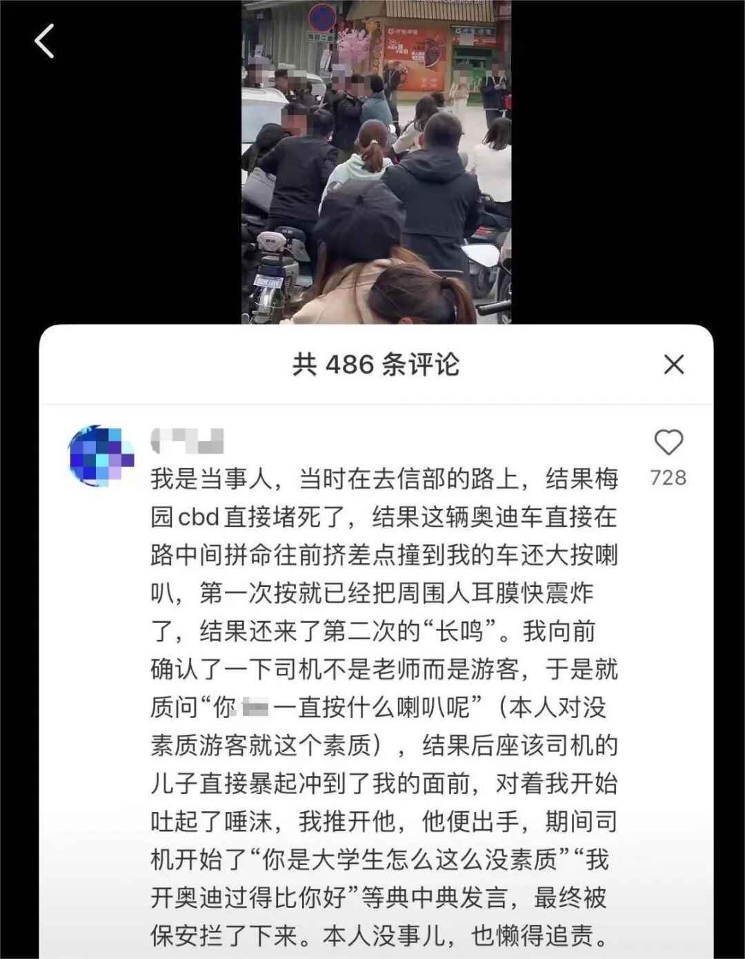 有男子发了身穿绿衣的照片,自称是当事人,并且是学生。“这辆奥迪车直接在路中间拼命往前挤,差点撞到我的车还大按喇叭。第一次按就已经把周围人耳膜快震炸了,结果还来了第二次的‘长鸣’。我向前确认了一下,司机不是老师而是游客,于是就质问对方……”