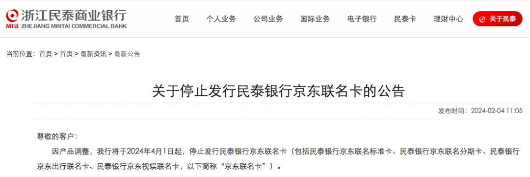 浙江民泰商业银行此前公告表示,2024年4月1日起,将停止发行民泰银行京东联名卡,包括民泰银行京东联名标准卡、民泰银行京东联名分期卡、民泰银行京东出行联名卡、民泰银行京东视娱联名卡。