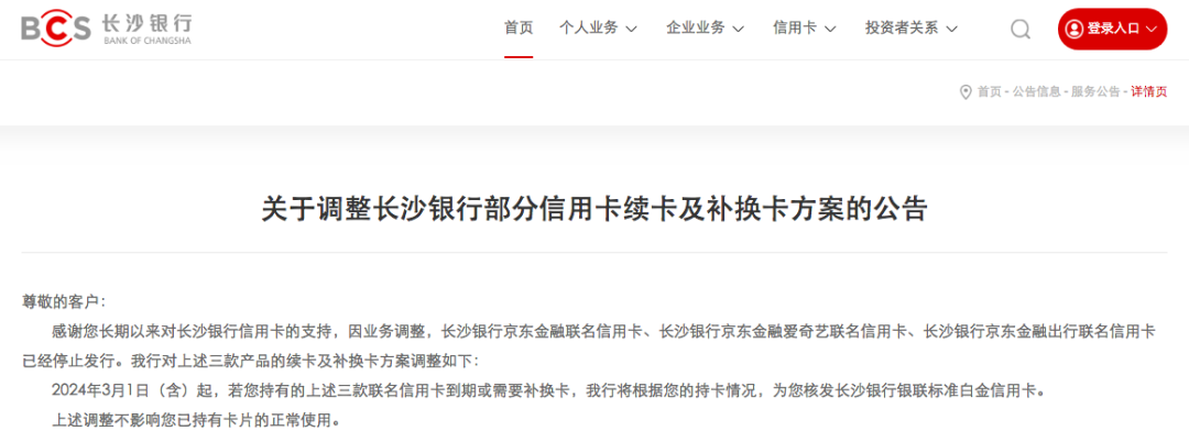 3月初,长沙银行发布《关于调整长沙银行部分信用卡续卡及补换卡方案的公告》,提到因业务调整,长沙银行京东金融联名信用卡、长沙银行京东金融爱奇艺联名信用卡、长沙银行京东金融出行联名信用卡已经停止发行。