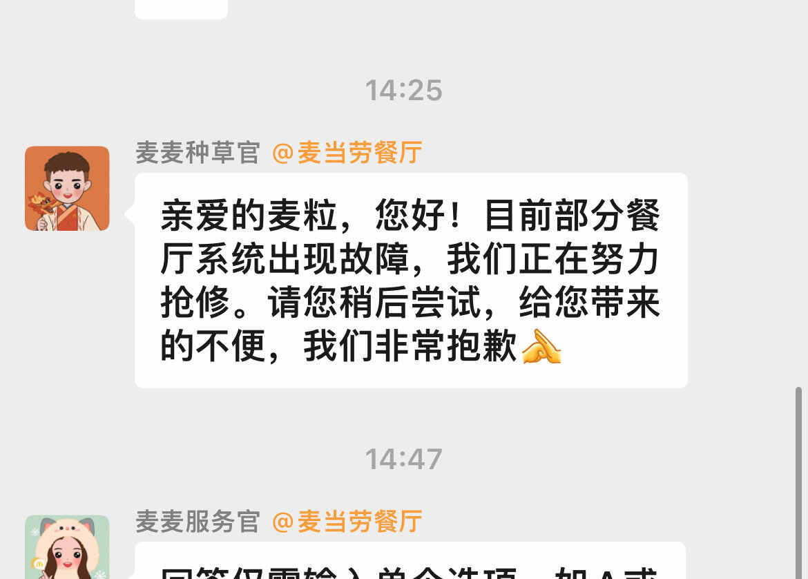 3月15日,有网友反映“麦当劳崩了”,麦当劳App、小程序出现无法点单、菜单无法刷新及卡券无法使用等状况。还有有麦当劳店员在用户群中表示,部分餐厅系统出现故障,正在努力抢修,请消费者稍后尝试。