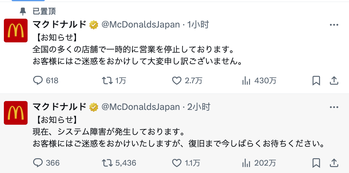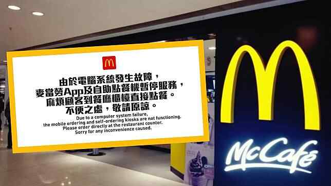 此次系统崩溃并非只有中国大陆地区。今天(15日)下午,全球多个国家和地区的麦当劳系统均出现了系统故障。香港麦当劳今天下午在Facebook发帖称,由于电脑系统发生故障,麦当劳App及自助点餐机暂停服务,顾客须到餐厅柜台直接点餐。