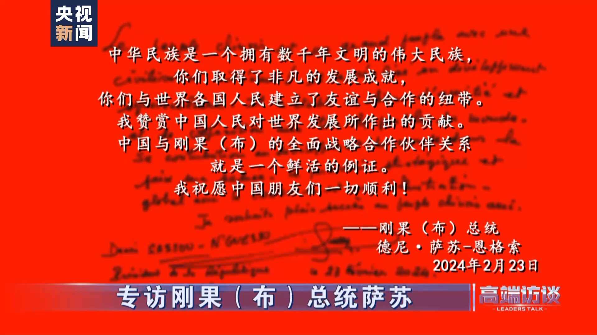 刚果(布)总统萨苏在接受总台专访后题词