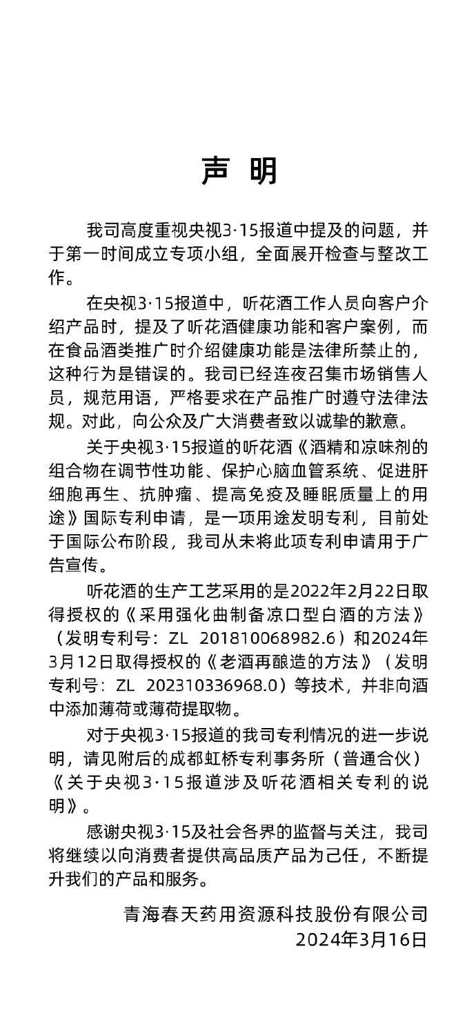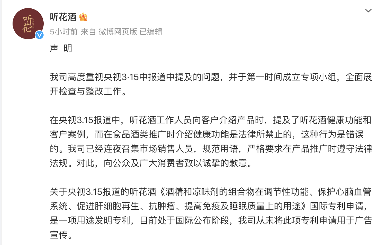 听花酒在声明中表示,在央视3·15报道中,听花酒工作人员向客户介绍产品时,提及了听花酒健康功能和客户案例,而在食品酒类推广时介绍健康功能是法律所禁止的,这种行为是错误的。该公司已经连夜召集市场销售人员,规范用语,严格要求在产品推广时遵守法律法规。对此,向公众及广大消费者致以诚挚的歉意。
