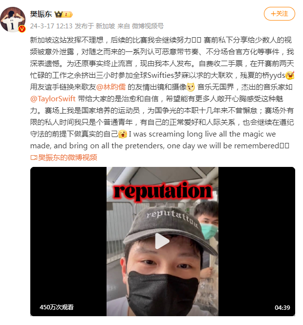 由于赛前曝出了樊振东现身泰勒·斯威夫特(霉霉)新加坡演唱会现场的视频,有网友批评他是因此耽误训练,才导致了比赛的失利。17日,樊振东晒出vlog并发长文正式回应此次追星风波。
