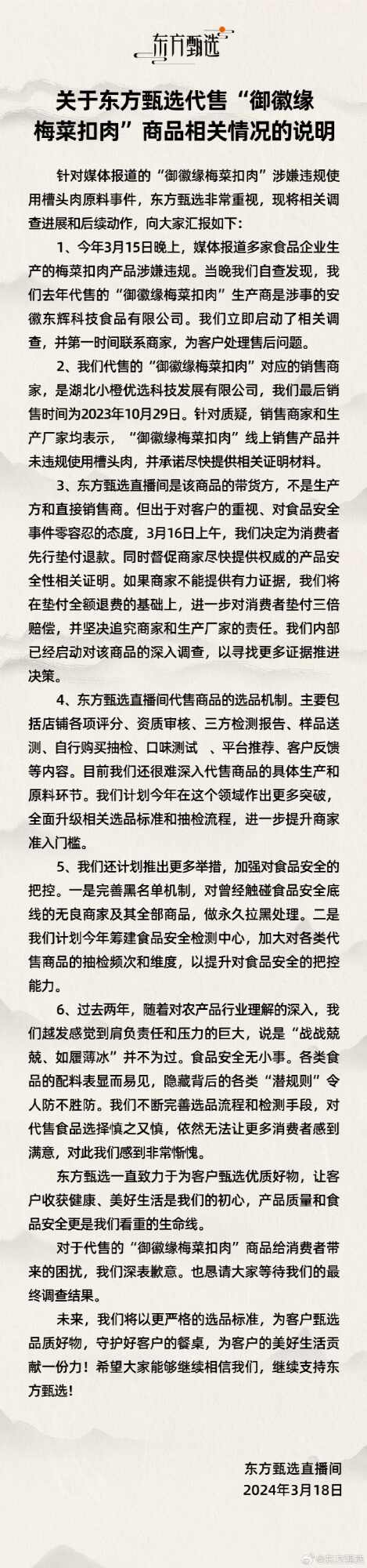 3月18日,东方甄选官方微博发布声明,回应代售的“御徽缘梅菜扣肉”涉嫌违规使用槽头肉原料问题:当晚自查发现,去年代售的“御徽缘梅菜扣肉”生产商是涉事的安徽东辉科技食品有限公司;代售的“御徽缘梅菜扣肉”对应的销售商家,是湖北小橙优选科技发展有限公司,东方甄选的最后销售时间为2023年10月29日。针对质疑,销售商家和生产厂家均表示,“御徽缘梅菜扣肉”线上销售产品并未违规使用槽头肉,并承诺尽快提供相关证明材料。