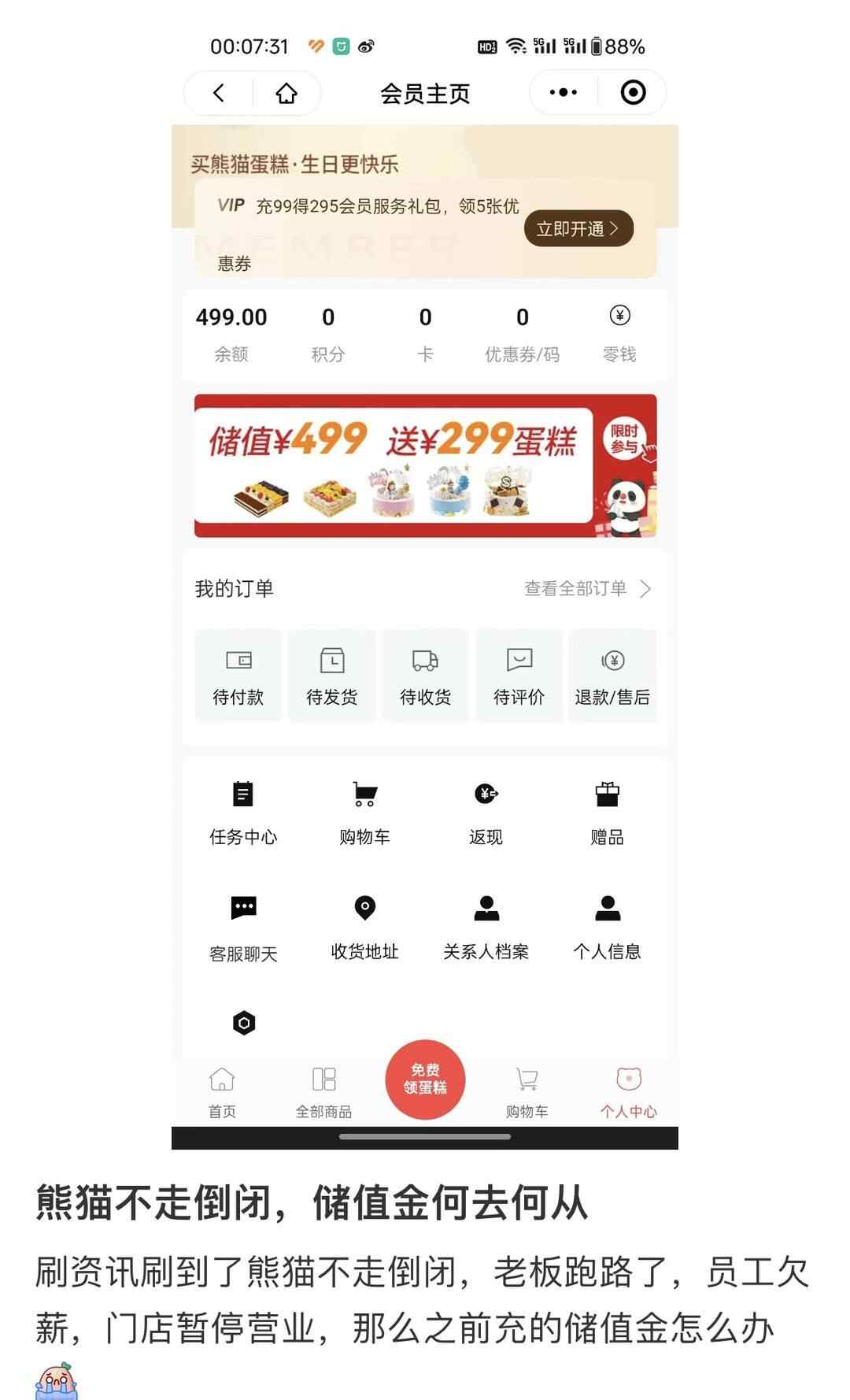 更多的消费者则表示,最近才充值了上百元的蛋糕卡,知道“熊猫不走”疑似倒闭的消息后想退款,但现在连客服都没了。互助群里的员工回应称,充值的钱直接到公司账号,大概率无法退款。记者看到,“熊猫不走”在全国拥有110多家直营店,但目前都处于暂停营业状态。