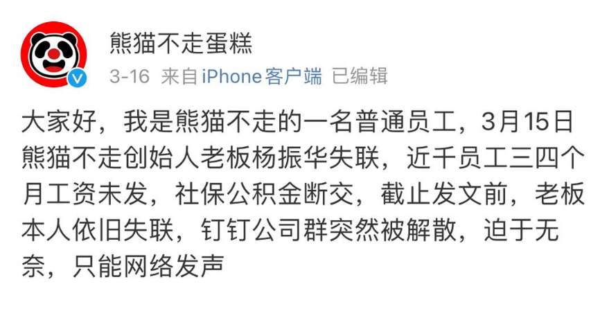 “熊猫不走蛋糕”官方账号3月16日更新的一则微博显示,“熊猫不走”创始人失联,近千名员工三四个月工资未发,“迫于无奈,只能网络发声”。一时间,这家网红蛋糕店引发了全网关注。