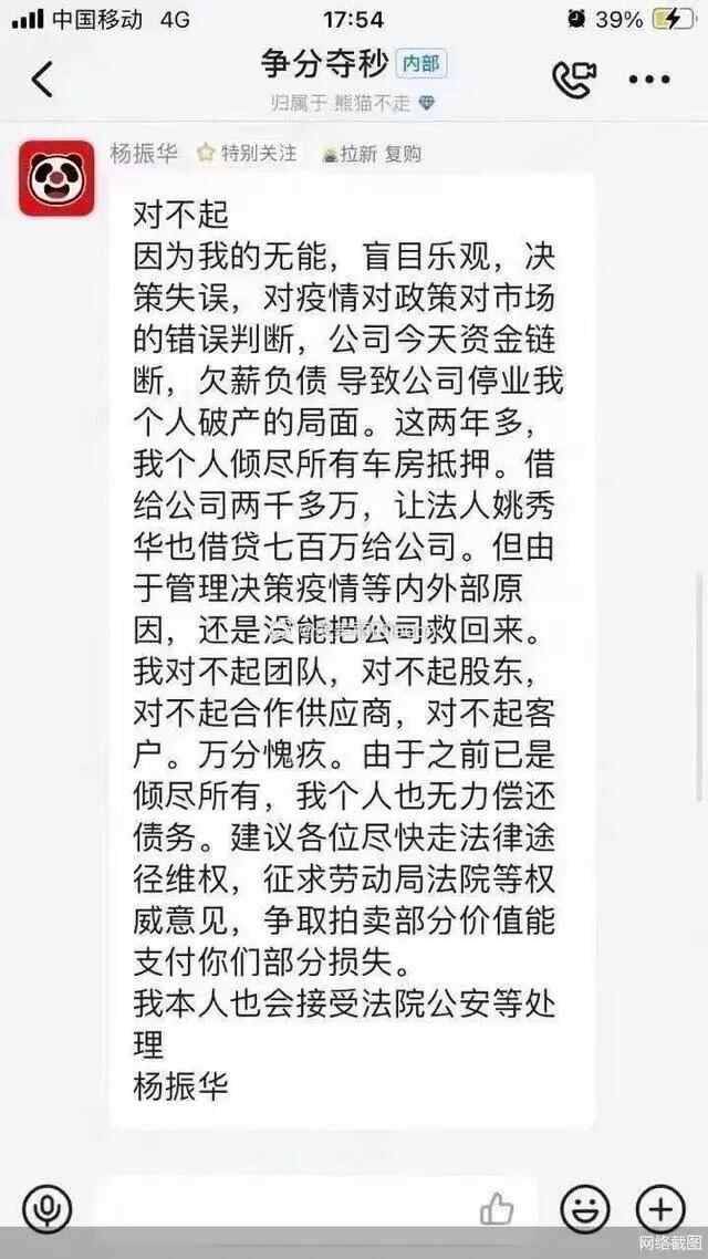 “因为我的无能,盲目乐观,决策失误,对疫情对政策对市场的错误判断,公司今天资金链断裂,欠薪负债,导致公司停业、我个人破产的局面。这两年多我个人倾尽所有车房抵押。借给公司两千多万,让法人姚秀华也借贷七百万给公司。”杨振华表示,由于之前已是倾尽所有,无力偿还债务,“建议各位同事尽快走法律途径维权,征求劳动局法院等权威意见,争取拍卖部分价值能支付你们部分损失”。其本人也会接受法院公安等处理。