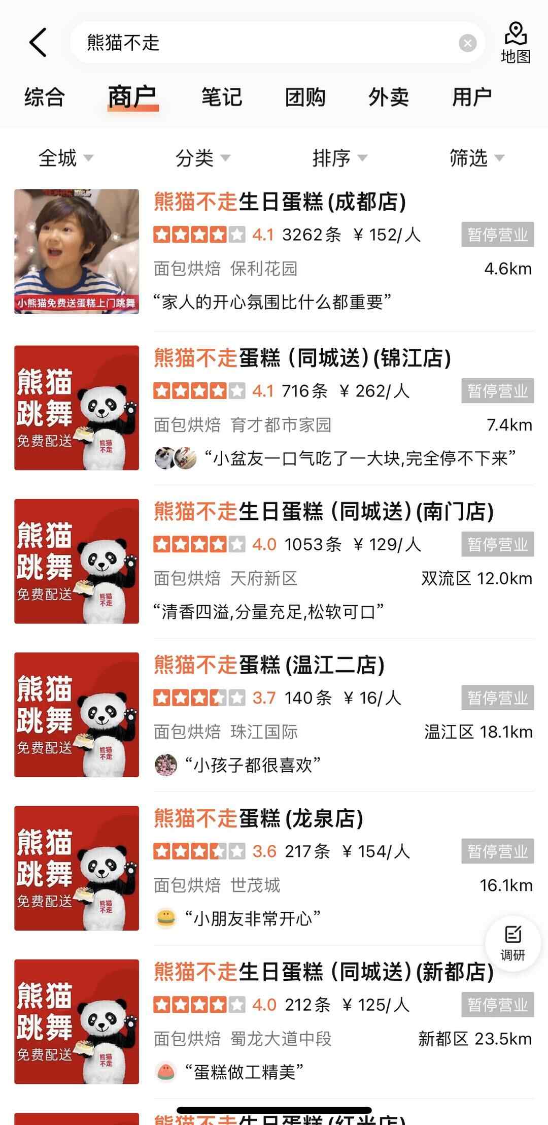 根据熊猫不走蛋糕微店,3月17日,熊猫不走蛋糕全国的网点均已经“暂停接单”,另外,根据大众点评网,其全国的网点均显示“暂停营业”。