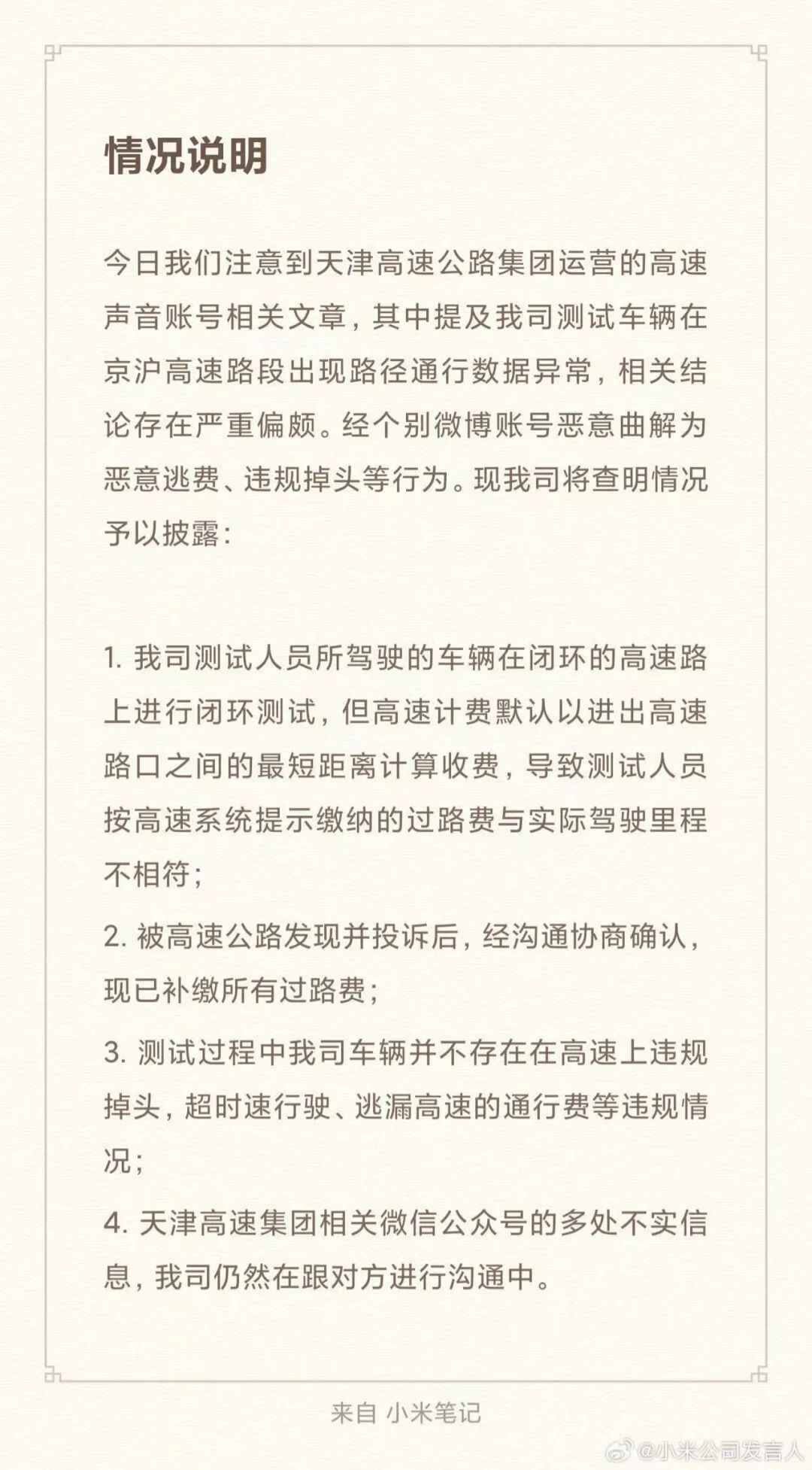 针对“测试车被天津高速抓到逃费”,小米公司发言人官方微博19日发布情况说明,称公司注意到天津高速公路集团运营的“高速声音”账号相关文章,其中提及小米公司测试车辆在京沪高速路段出现路径通行数据异常,相关结论存在严重偏颇。经个别微博账号恶意曲解为恶意逃费、违规掉头等行为。全文如下: