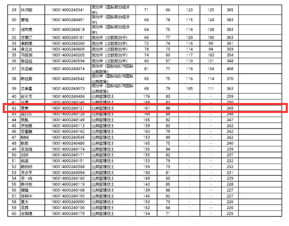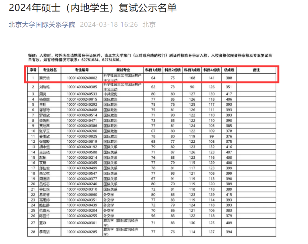 据媒体报道,记者查证发现,登上热搜的考生蔡元培,确实名列北京大学国际关系学院3月18日发布的《2024年硕士(内地学生)复试公示名单》中,并以388分的初试总成绩排名其复试专业——科学社会主义与国际共产主义运动专业第一,科目4(专业课)还考出了141分的高分。