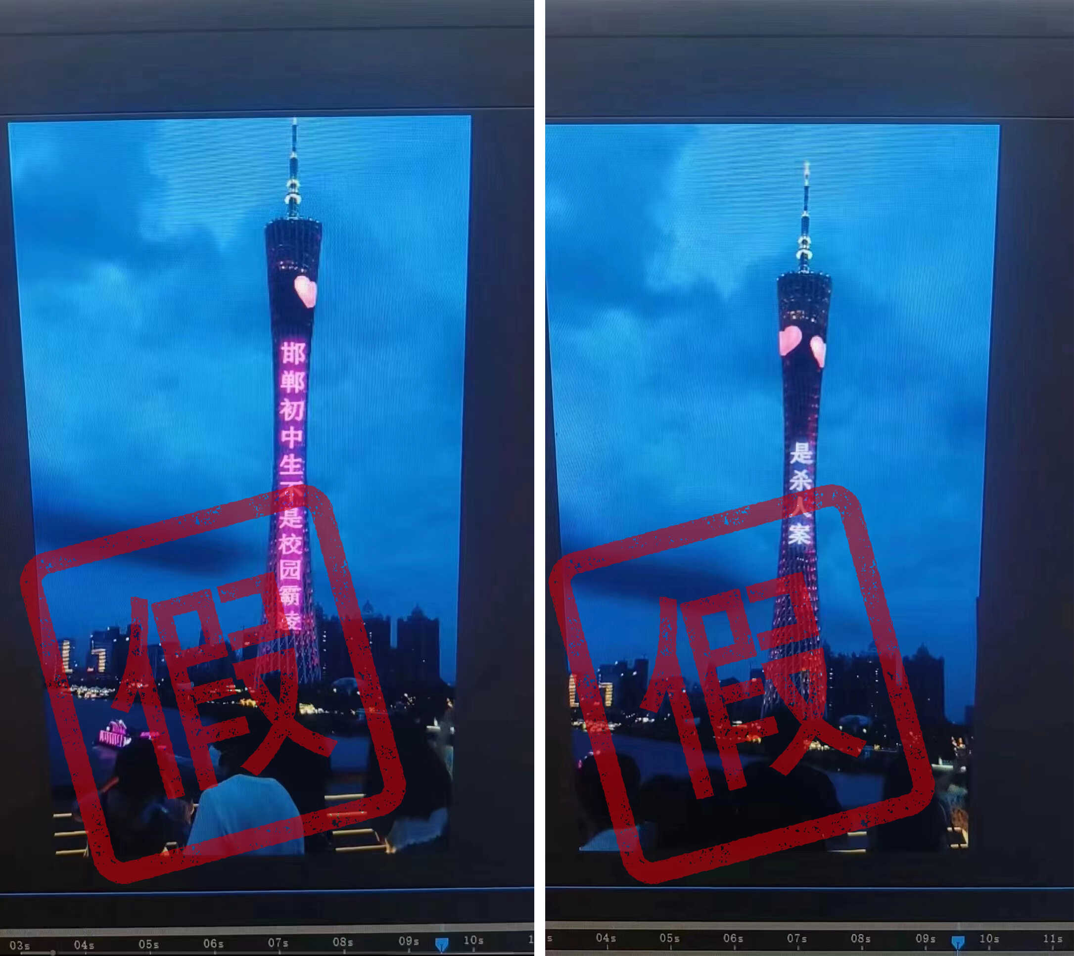 此外,记者注意到,网传照片的标语是竖排格式,而广州塔的字幕广告位位于其上端,多为横排滚动播出。