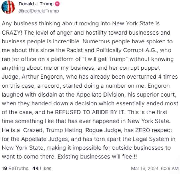 特朗普还将这个案子的影响上升到“影响纽约州经济”的高度,直言纽约的企业看到这个案子,怕是会被吓得逃走。